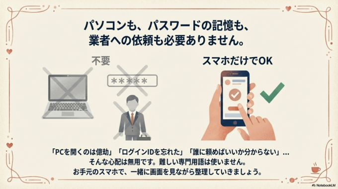 そんなふうに悩んで、そのままになっていませんか? 実はこれ、業者さんに頼まなくても、お手元のスマートフォンから簡単に直せるんです。 難しい専門用語は使いません。一緒に画面を見ながら、少しずつ整理していきましょう。
