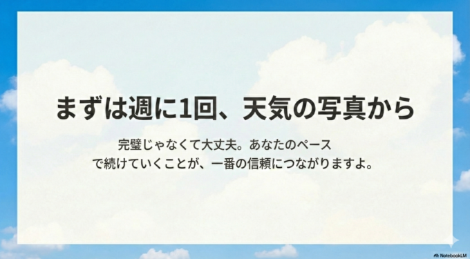 まずは週に1回、天気の写真から始めてみませんか? 完璧じゃなくて大丈夫。あなたのペースで続けていくことが、一番の信頼につながりますよ。