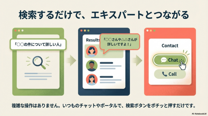 【図③:できた状態】 AIが「〇〇さんや△△さんが詳しいですよ!」と、おすすめの人をポンッと画面に出してくれます。