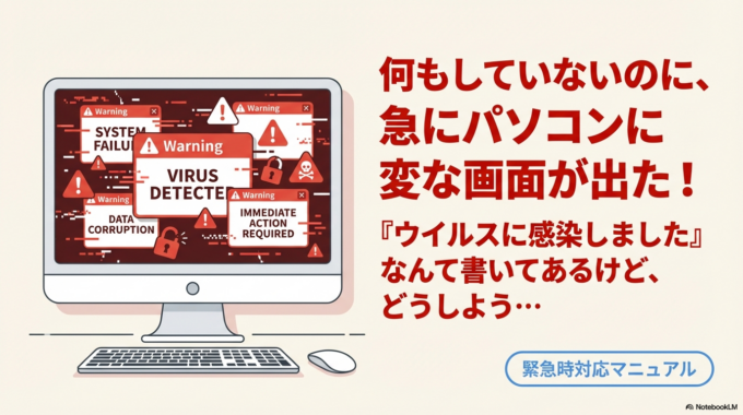「何もしていないのに、急にパソコンに変な画面が出た!」 「『ウイルスに感染しました』なんて書いてあるけど、どうしよう…」