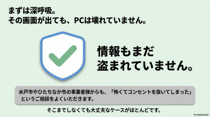 でも、まずは深呼吸してください。その画面が出ただけでは、まだパソコンは壊れていませんし、情報も盗まれていません。